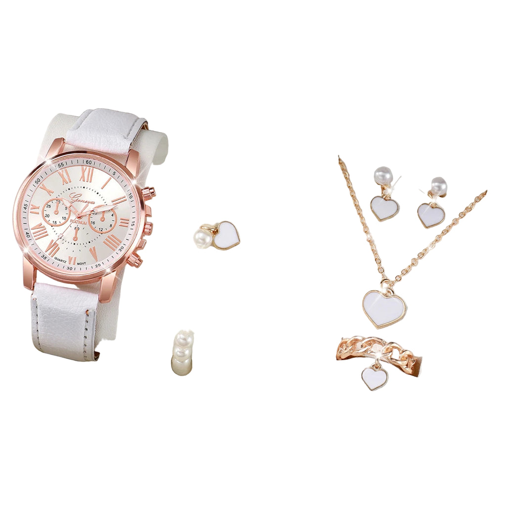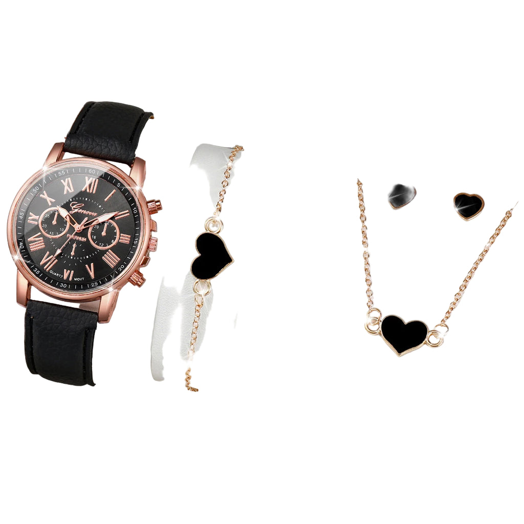 Acessório feminino, relógio de quartzo pulseira de couro analógico relógios de pulso coração e conjunto de jóias (sem caixa)